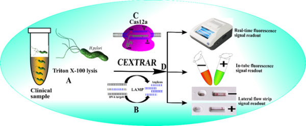 中國(guó)科學(xué)院廣州生物醫(yī)藥與健康研究院李志遠(yuǎn)團(tuán)隊(duì)通過(guò)環(huán)介導(dǎo)等溫?cái)U(kuò)增(LAMP)結(jié)合最新的CRISPR/Cas12a技術(shù),提出針對(duì)高致病性幽門(mén)螺旋桿菌菌株的高敏感度檢測(cè)方法。該方法僅需檢測(cè)唾液樣本,便可快速精準(zhǔn)檢測(cè)出感染該菌株的陽(yáng)性病人。近日,相關(guān)研究成果以Harnessing enhanced CRISPR/Cas12a trans-cleavage activity with extended reporters and reductants for early diagnosis of Helicobacter pylori, the causative agent of peptic ulcers and stomach cancer為題,發(fā)表在Biosensors and Bioelectronics上。