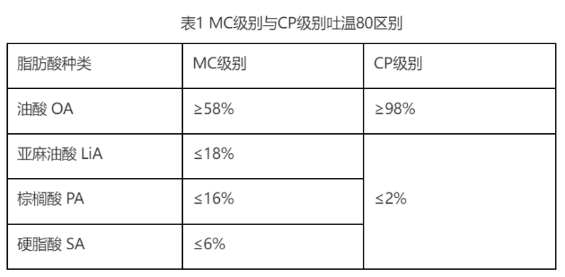 作為常用的藥物輔料,市售注射用吐溫80主要有MC(多藥典級)和CP(中國藥典級)兩種級別,其主要差異在油酸含量上,見表1。其中,CP級別常用供應商日油和南京威爾,MC級別有JT、Sigma和禾大等。
