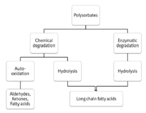 吐溫80可能被光照、溫度,過氧化物、氧氣或痕量金屬離子等影響因素氧化,氧化位置常見脂肪酸鏈雙鍵、母核的醚鍵和部分酯鍵,降解產物有自由基、過氧化物、游離脂肪酸、短鏈烷烴、醛、酮、酸等。而生成的過氧化物可能繼而引起蛋白質氧化。